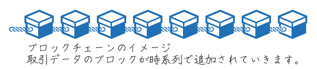 ブロックチェーンのイメージ 取引データのブロックが時系列で追加されていきます。
